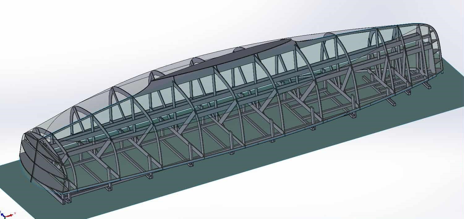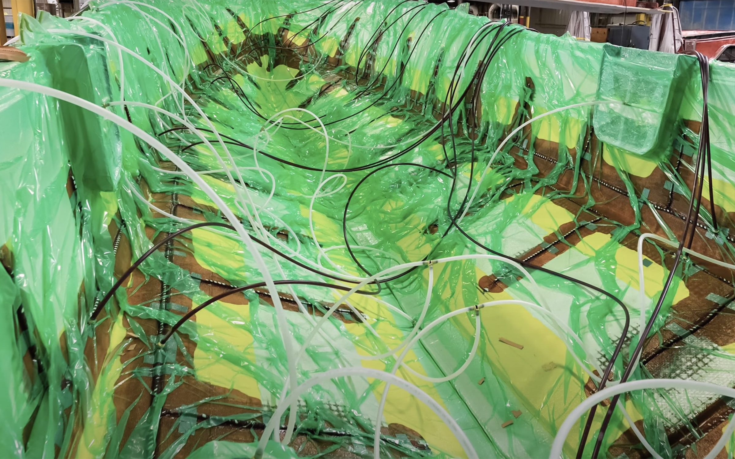 Manufacture and testing of a fiberglass composite hull structure for yacht applications, focusing on durability and weight reduction.